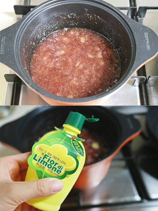4. 잼이 어느 정도 졸아들면 레몬즙 1 큰 술을 넣고, 조금 더 졸여주세요.