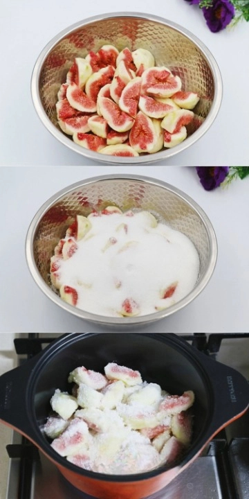 3. 무화과 500g에 설탕 250g을 넣고 버무려준 다음 냄비에 내용물을 넣고 중불로 끓여주시면 무화과 열매에서 과즙이~